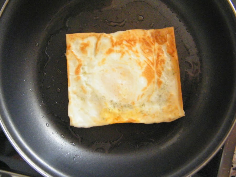 4. Cuando el aceite esté bien caliente, echamos con mucho cuidado el paquetito a la sartén con el aceite ya caliente y dejamos que se dore. A la vez vamos echando aceite de la sartén sobre el otro lado con una cuchara o le damos la vuelta con mucho cuidado para que se haga del todo.
