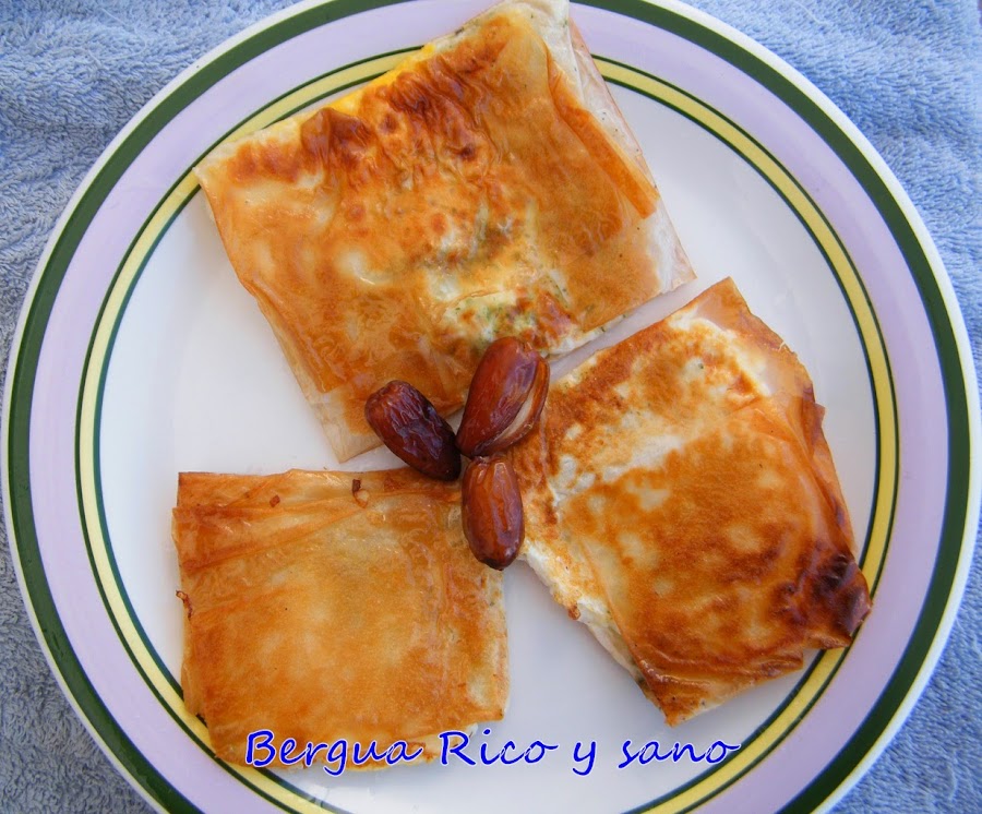 Este tipo de briouat hay que manejarlo con delicadeza al hacerlo, pero el truco de la receta radica precisamente en su sencillez. No son triangulares, como suelen ser los briouats de carne o de almendra, sino que son un paquetito cuadrado. De niña lo probé en un restaurante árabe de Alicante que ya no existe; ya de mayor, y no habiendo vuelto a encontrarlo en ningún menú, me he propuesto revivir la experiencia en casa.