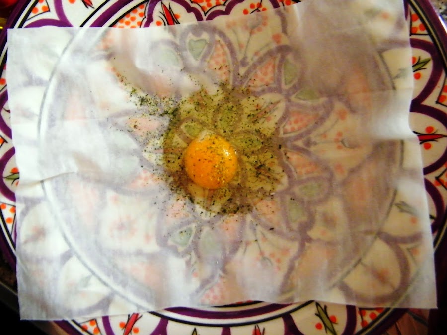 3. Sazonamos, añadimos el perejil picado y cerramos el briouat con cuatro dobleces, como si fuera un paquetito de regalo.