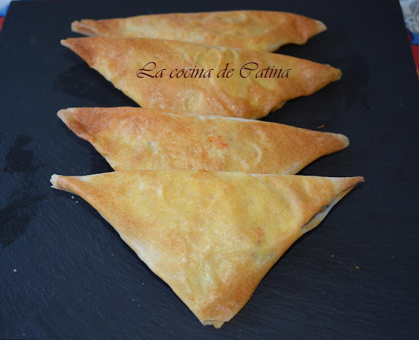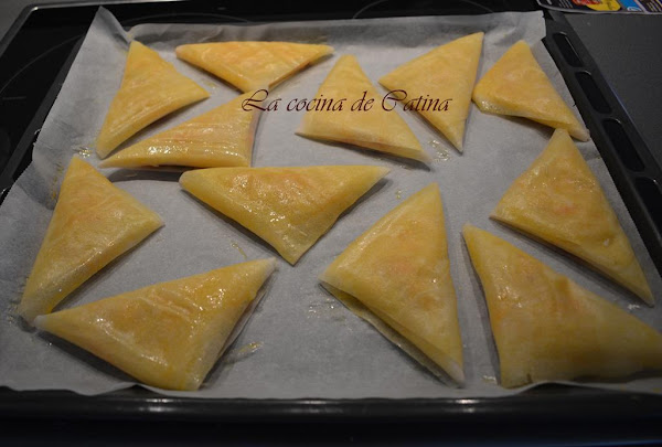 Preparamos la masa cortando la masa en rectángulos de la medida que creamos conveniente (yo los he preparado en 10x25 centímetros). Una vez hechas las tiras de masa colocamos una cucharada de relleno en el extremo inferior y vamos plegando en forma de triángulo. Cuando lleguemos al final de la tira, pintamos con huevo batido para que quede bien sellado.