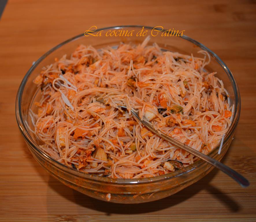 Troceamos los mejillones cocidos y los langostinos cocidos, añadimos la harissa, la sal, la pimienta, el comino y el ajo molido, mezclamos bien con el aceite y el vinagre y dejamos reposar unos 30 minutos.