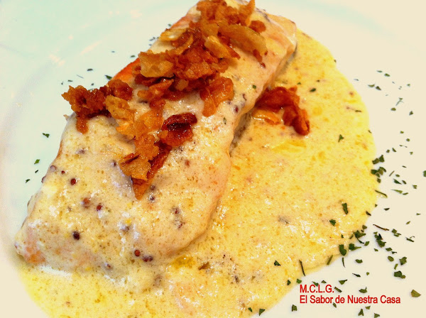 Sirve esparciendo eneldo, algo de perejil y cebolla crujiente. Puede ir acompañado de patatas pequeñas hervidas pasadas por mantequilla y especias; si es así, te conviene añadir más nata (crema de leche) para esparcir sobre esta guarnición. Rectifica de sal y mostaza y...¡Ya verás que rico!Nota: también puedes cortar el salmón en trozos más pequeños.