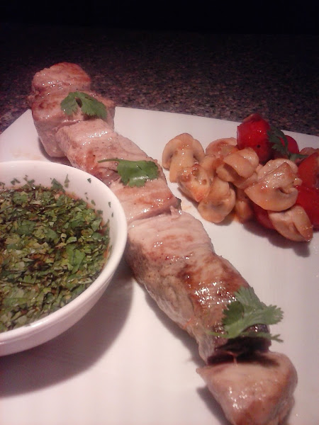 Curiosidades. Se llama "limón" por unas rayas doradas que tiene en el lomo. Dicen que es el primo pobre del atún. Se asemeja bastante su rodaja, muy carnosa y sonrosada. Conviene saber (por si dais con él) que es un pescado azul, con carne grasa y alto contenido en Omega 3, punto a favor. Es bastante sabroso y no necesita de grandes parafernalias para cocinarlo, de ahí que yo me haya ido a una brocheta común, y alegre el plato con un salteado de champiñones y tomate y una deliciosa salsa para potenciar aún más los sabores de mar. Pues sabiendo todo esto, es hora de ponerse en faena, nunca mejor dicho. ¡Mandiles arriba!