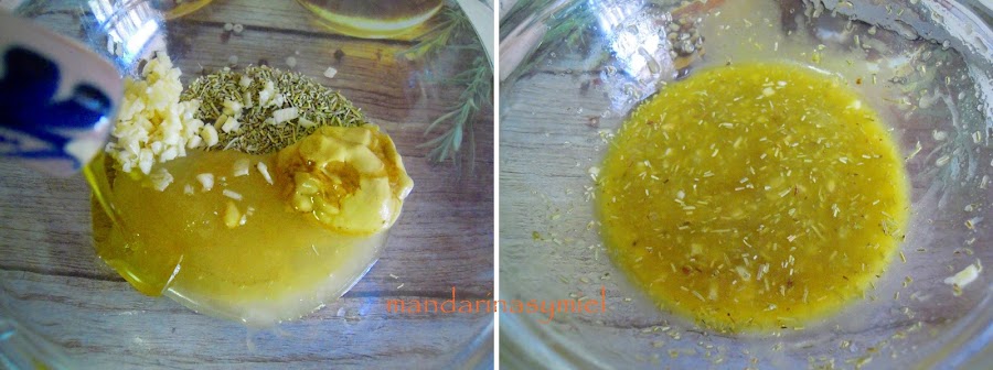 En un bol mezcla la mostaza, la miel, el romero, el tomillo, el ajo picado, el zumo de limón, un chorrito de aceite y una pizca de sal, mezcla bien