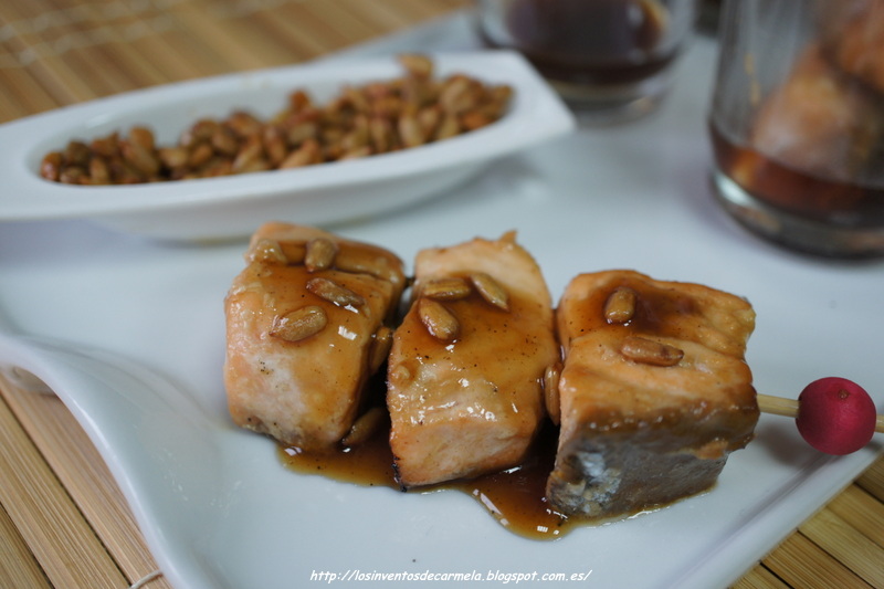 Para acompañar esta exótica brocheta había elegido copos de cebolla crujiente que ya no es difícil de conseguir en cualquier tienda, le da un toque muy bueno a la brocheta ya que el salmón es un pescado que combina muy bien con el sabor de la cebolla frita, perooooooooo en el caos de mi despensa no los he encontrado así que me he atrevido a probar las brochetas con estas semillas de girasol caramelizadas, y mira tú, que me ha encantado el contraste jeje, Carmela total !!