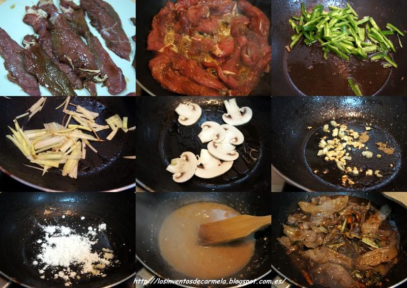 4) Calentar el wok a fuego fuerte, añadir la carne cortada en tiras finas y saltear 4 minutos sin dejar de mover. Sacar y reservar también el caldo que ha soltado aparte.