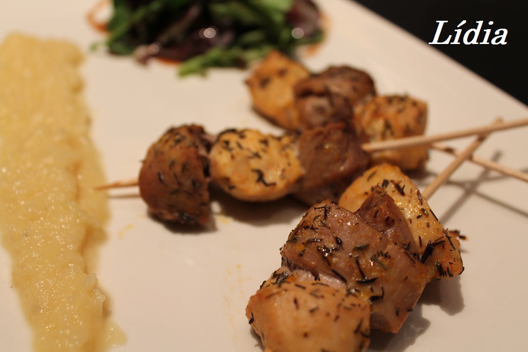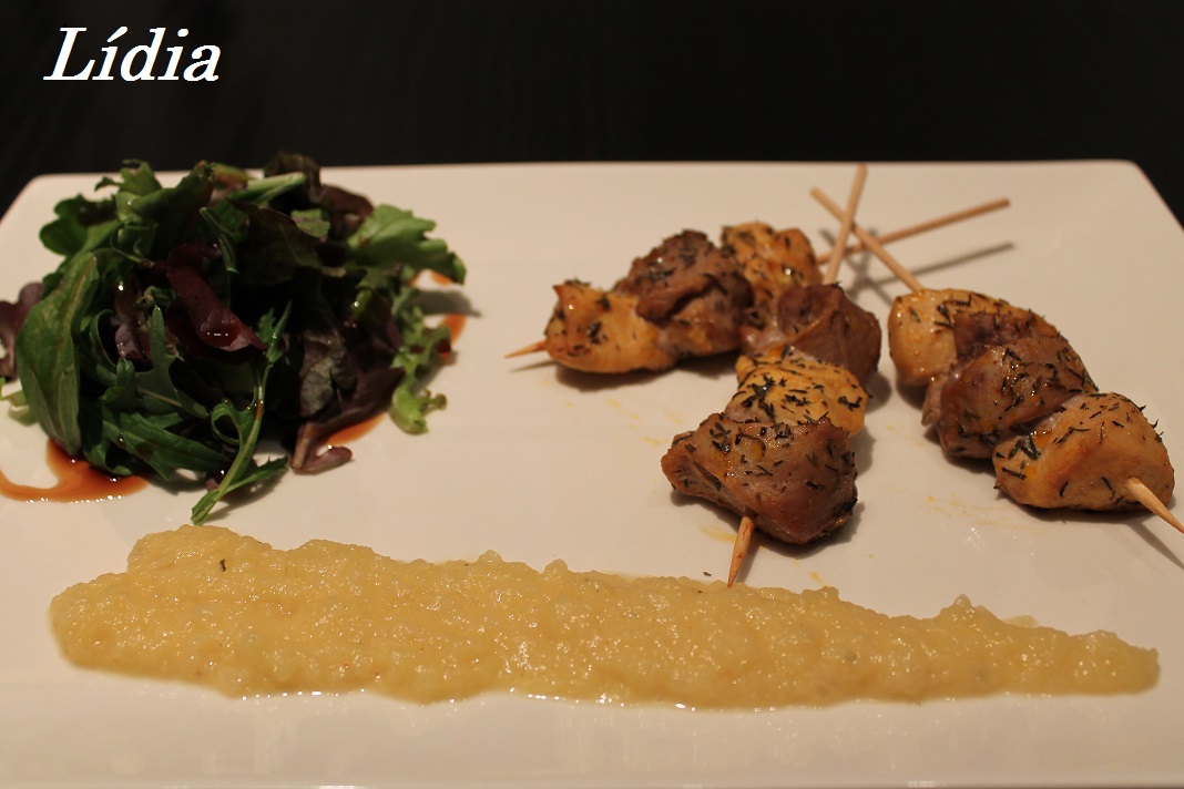 Yo he hecho unas brochetas con dos tipos de carne: pollo y solomillo, maceradas con tomillo y acompañadas de una ensalada con vinagre de frambuesa y una salsa de manzana (parezco de masterchef jeje)