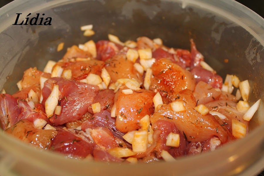 PARA MACERAR LA CARNE ponemos en un cuenco 1 cebolla cortada a trocitos, pimentón dulce, tomillo en especia, un poco de aceite y sal.