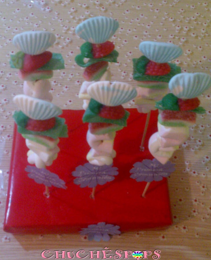 Las chuches que llevan son jamones,sandia,lengua de melon, fresa y una concha que corona la brocheta.