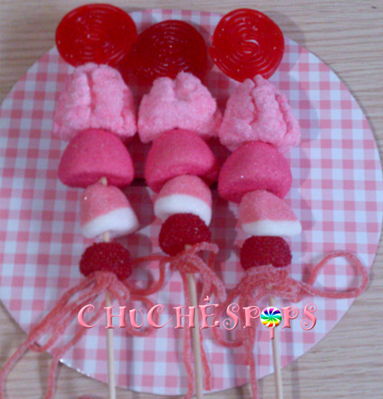 Y como no me gusta enseñar las chuches con el empaquetado porque con las bolsas siempre salen reflejos etc... os dejo la foto de las brochetas sin embolsar, para que babeéis un poco, me encanta la combinación de rosa y rojo.