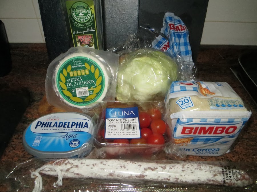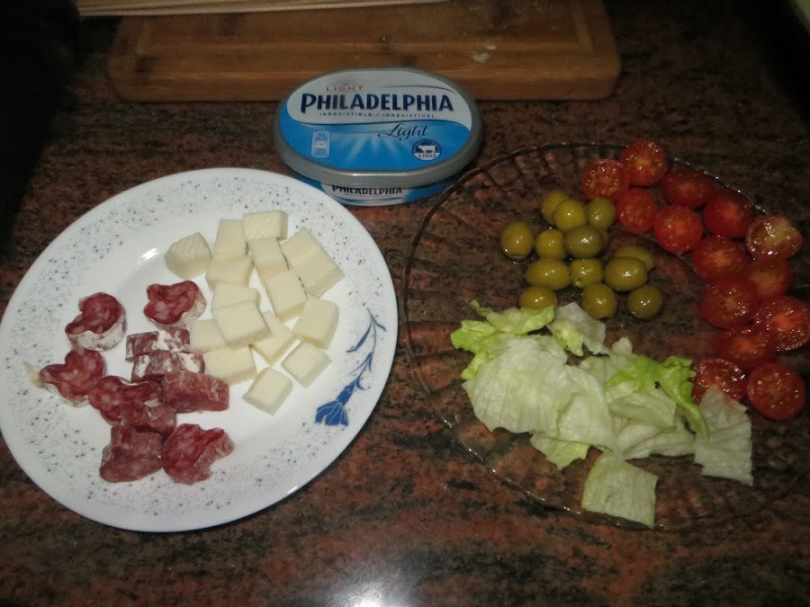 Por otra parte, cortamos en dos trozos los tomates cherry, en varios cachos la lechuga y el fuet y el queso en taquitos para luego poder insertarlo en las brochetas con facilidad.
