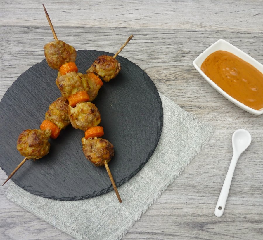 Una manera diferente de presentar las albóndigas, horneadas con rodajas de zanahoria en la propia brocheta y acompañadas de una salsa picante para chuparse los dedos. Y tan sencillo, si no hace falta complicarse para disfrutar.