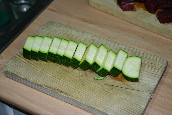 cortamos el calabacin en dados no muy grandes, al ser esto lo que mas tarda en hacerse os recomiendo que lo hagais pequeñito