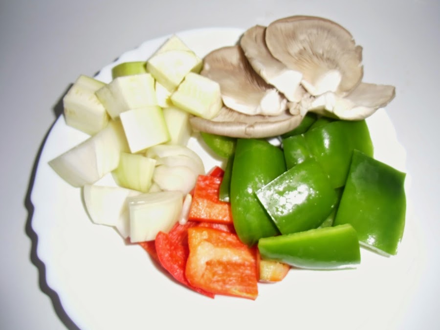 Hacemos lo mismo con la cebolla, el calabacín y los pimientos.