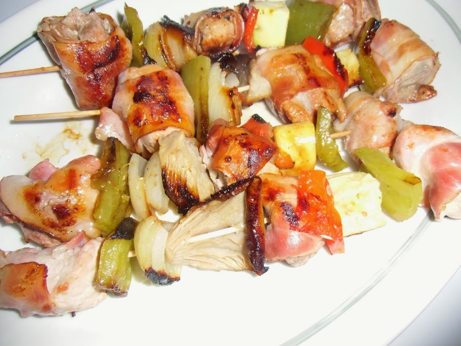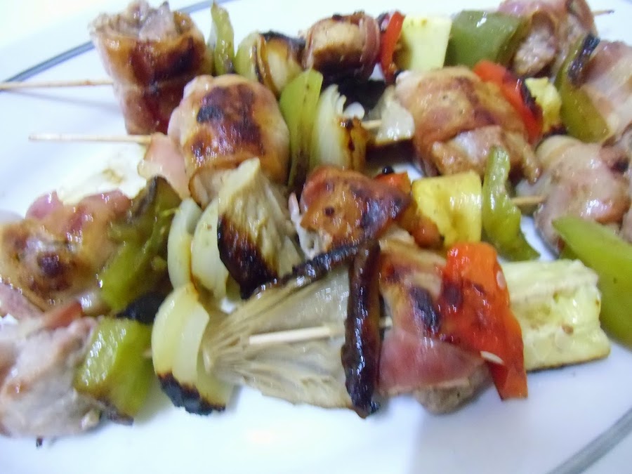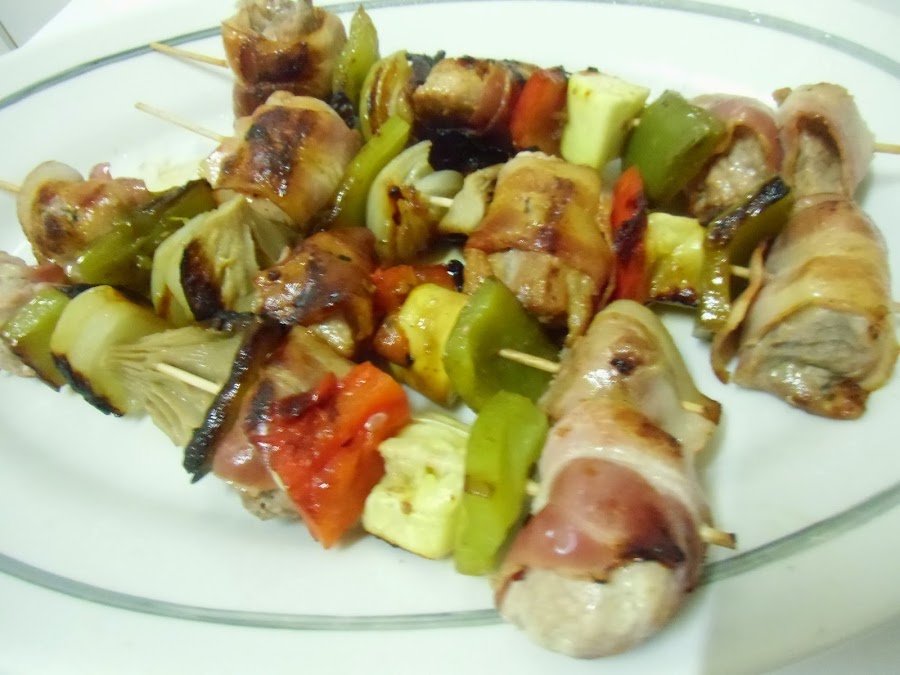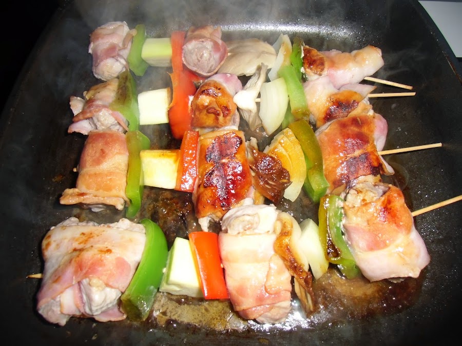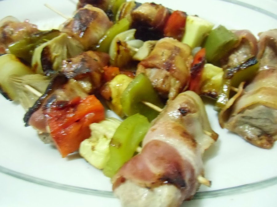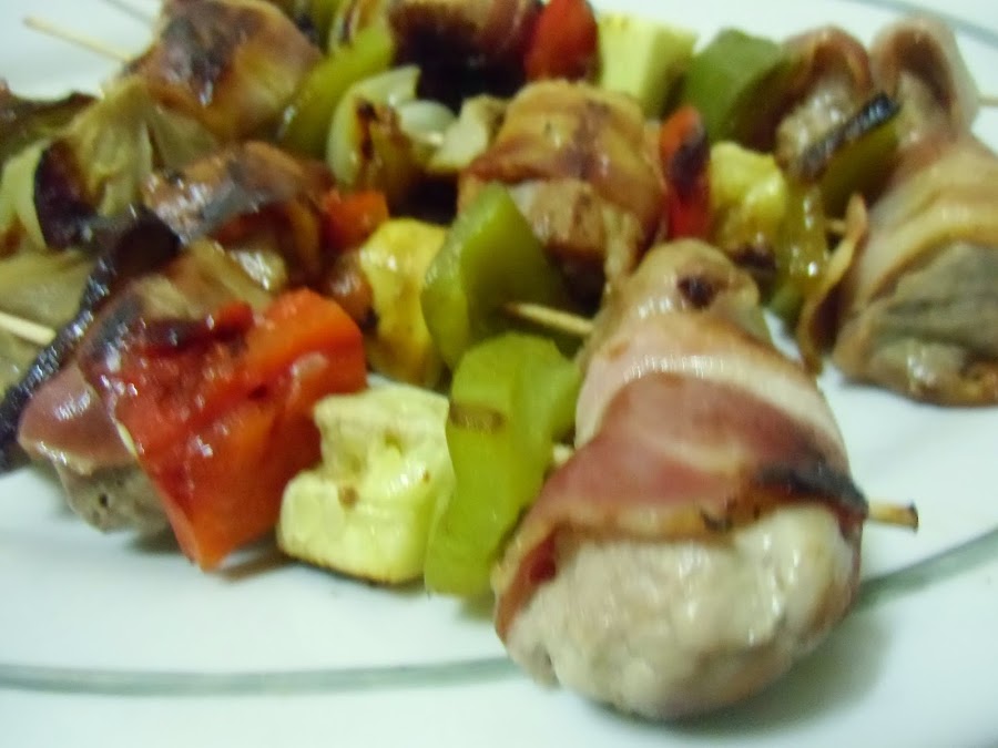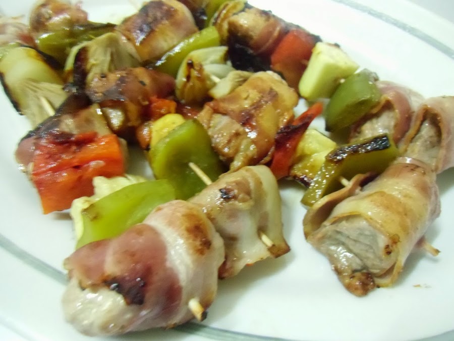 Montamos las brochetas enrollando cada trozo de carne en una loncha de bacon y alternando ingredientes.