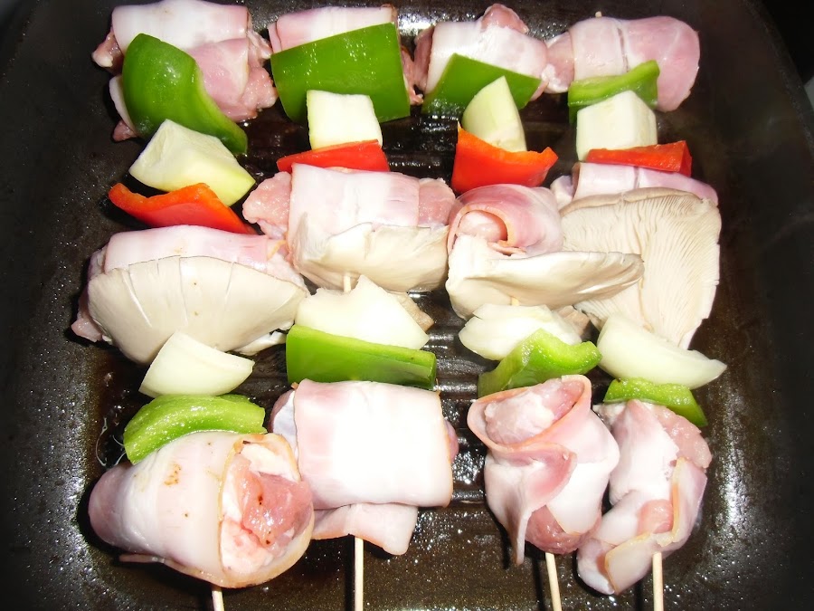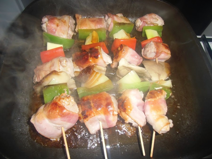 Cuando estén todas montadas, salpimentamos y las colocamos en una parrilla o plancha al fuego con un chorrito de aceite de oliva.