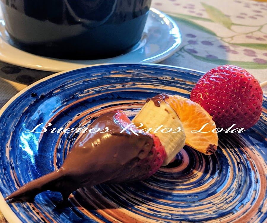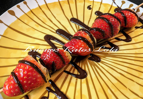 Ponemos el chocolate troceado o las perlas en la olla y programamos alta. A la media hora añadimos una cucharada de mantequilla (opcional) Esto hará que el chocolate brille más. Removemos cada 10 minutos hasta que esté líquido. Sacamos del cuerpo de la olla y cubrimos al gusto las brochetas
