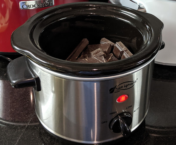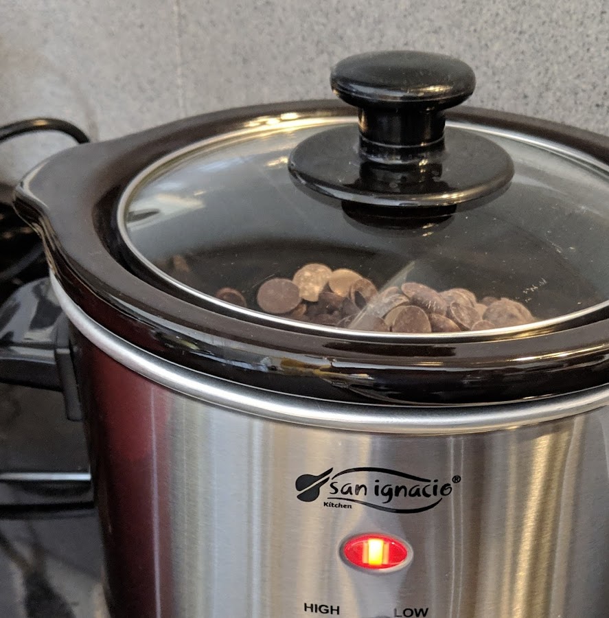 Yo he fundido el chocolate en olla lenta, para luego usar la cubeta como foundie. Puedes prepararlo al baño maría, en el microondas...
