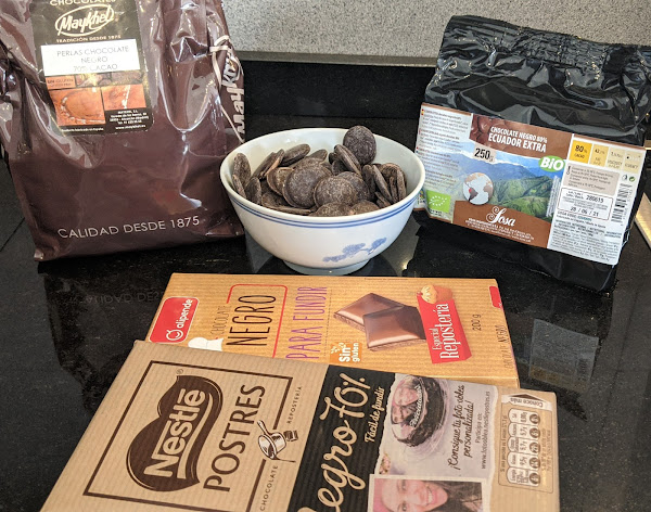 Puedes utilizar chocolate de tableta, troceado, especial para fundir o perlas de chocolate. En la foto hay 2 tabletas del 70% y 55% de cacao y perlas con el 70% y el 80% respectivamente
