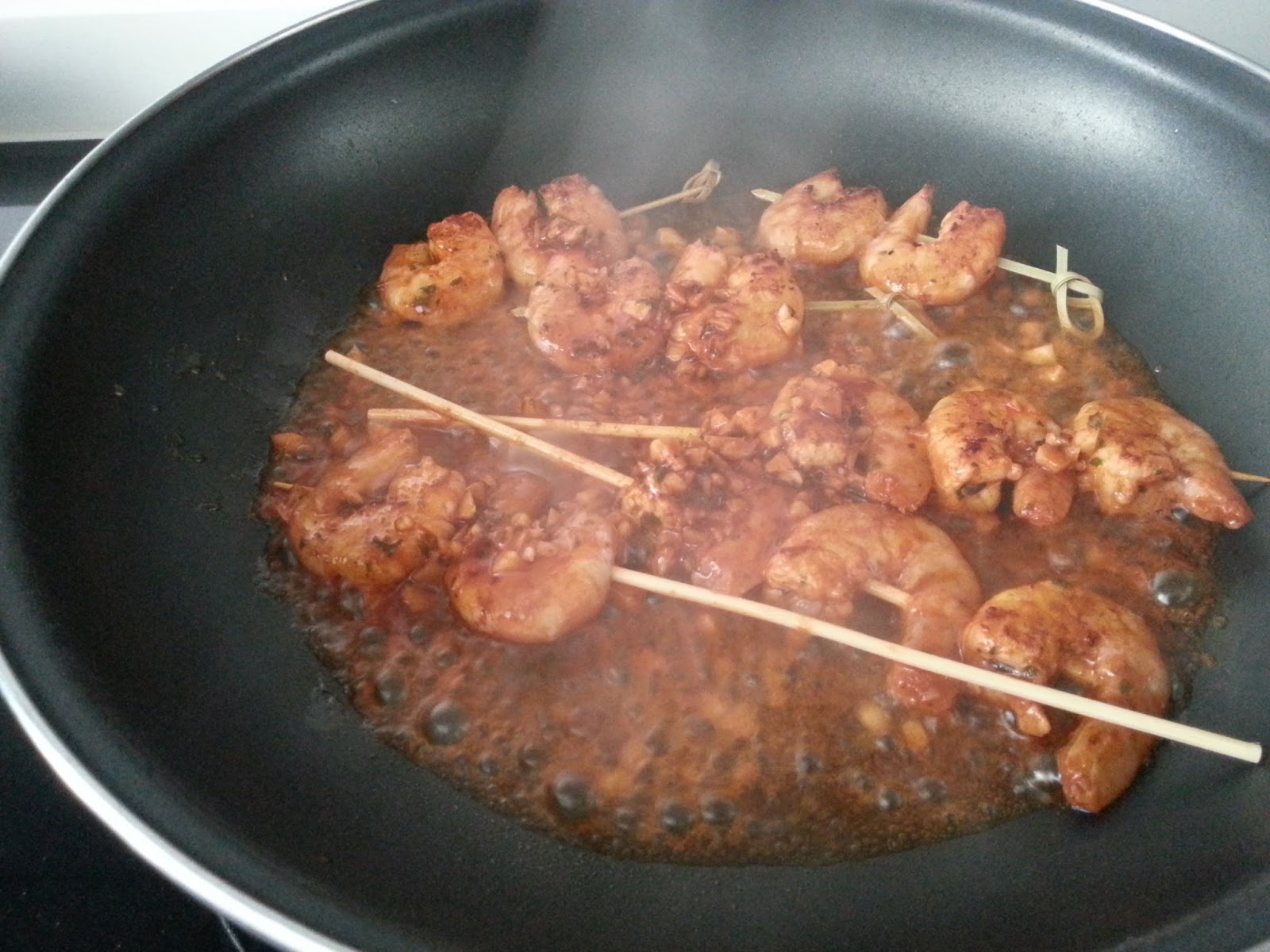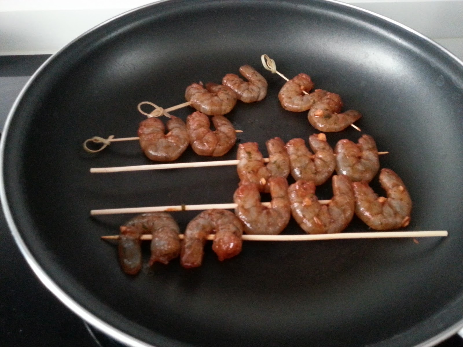 5. - Ponemos una sartén amplia, a fuego fuerte, y cuando esté bien caliente, ponemos las brochetas, un minuto por cada lado.