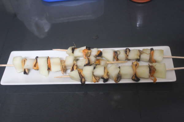 Y solo resta insertar en palitos de brochetas los daditos de melón intercalando entre cada dadito de melón un mejillón.