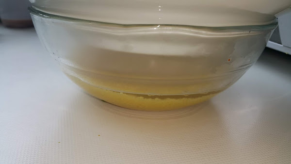 Empezaremos hidratando el cous-cous. Para ello ponemos la cantidad de cous-cous que deseemos en un bol de cristal y le añadimos la misma cantidad de agua hirviendo. Tapamos y dejamos unos minutos hasta que absorba todo el agua.