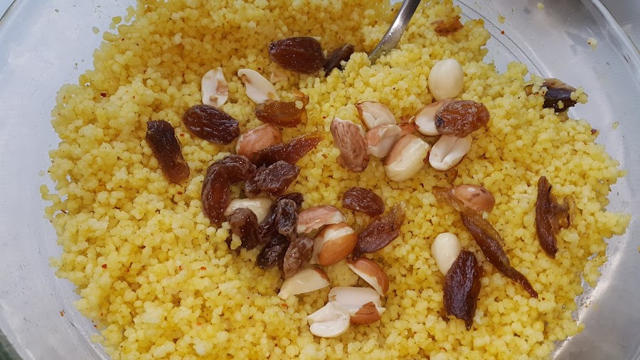 Una vez se haya quedado sin agua el cous-cous, le añadimos un chorro de aceite de oliva y, con la ayuda de un tenedor, desmigamos la pasta hasta que se suelten los granos de nuevo. Añadimos el ras el hannout al gusto junto con un poco de pimienta recién molida y tajin.