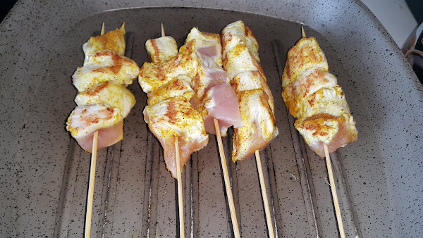 Montamos las brochetas y les añadimos unas gotas de aceite.