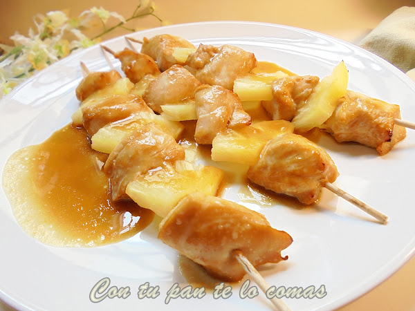 Éstas son de pavo aunque las puedes hacer con pollo exactamente igual. Eso si, no cambies la piña porque los sabores casan como pocos, y la salsita que las acompaña tampoco te la pierdas, verás qué cosa más rica!