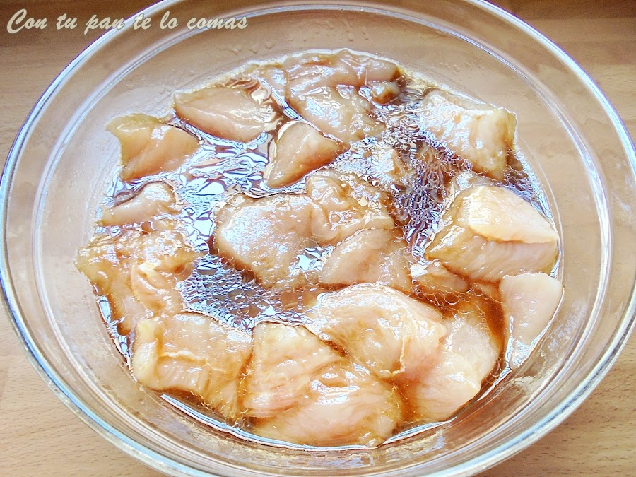 1. Trocear la pechuga de pavo en dados medianos, ponerlos en un bol y dejarlos macerar con la salsa de soja, el zumo de la mandarina (o naranja) y la cucharada de aceite. Guardar en la nevera tapado por lo menos una hora.