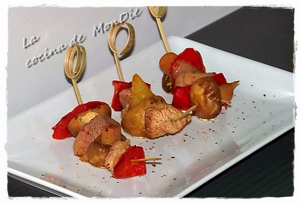 Finalmente insertar en brochetas los ingredientes y poner cayena molida al gusto.
