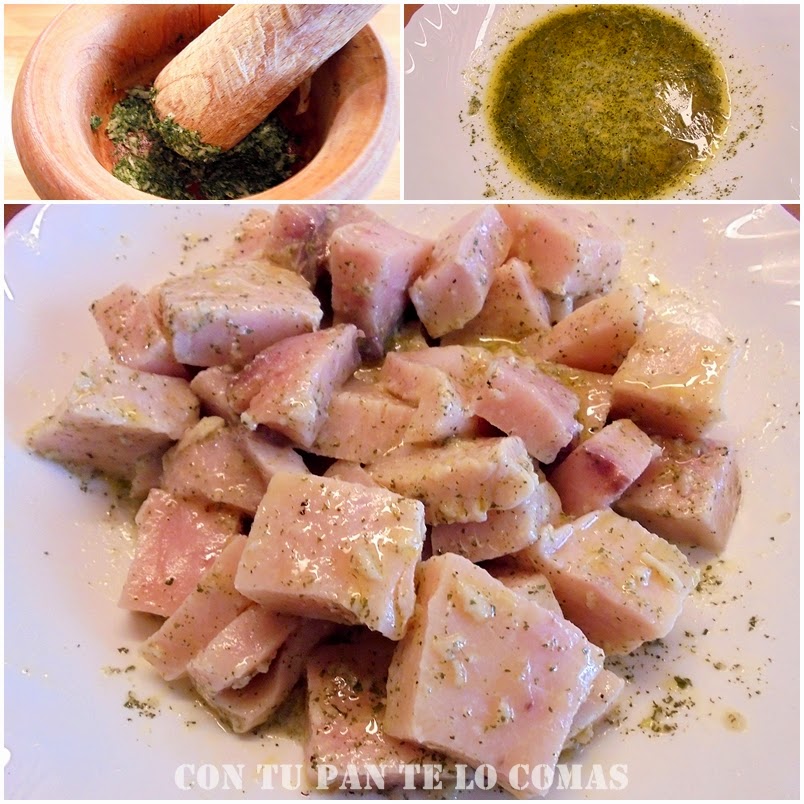 3. Cortamos el pescado en dados grandes y los sazonamos con sal y pimienta. Los metemos en la fuente con la marinada y los untamos bien por todos lados. Lo dejaremos tapado por lo menos 30 minutos removiéndolo de vez en cuando.