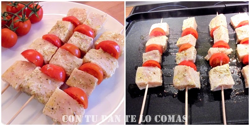 Esta receta lleva los mismos ingredientes pero con la diferencia de que marinamos el pescado primero durante un rato y luego lo ensartamos en brochetas con unos tomatitos cherry. Al estar marinado en limón, podríamos decir que está medio cocido por lo que el paso por la plancha es muy rápido y queda muy jugoso. En esta ocasión lo he hecho con pescado congelado por lo que además sale muy bien de precio.