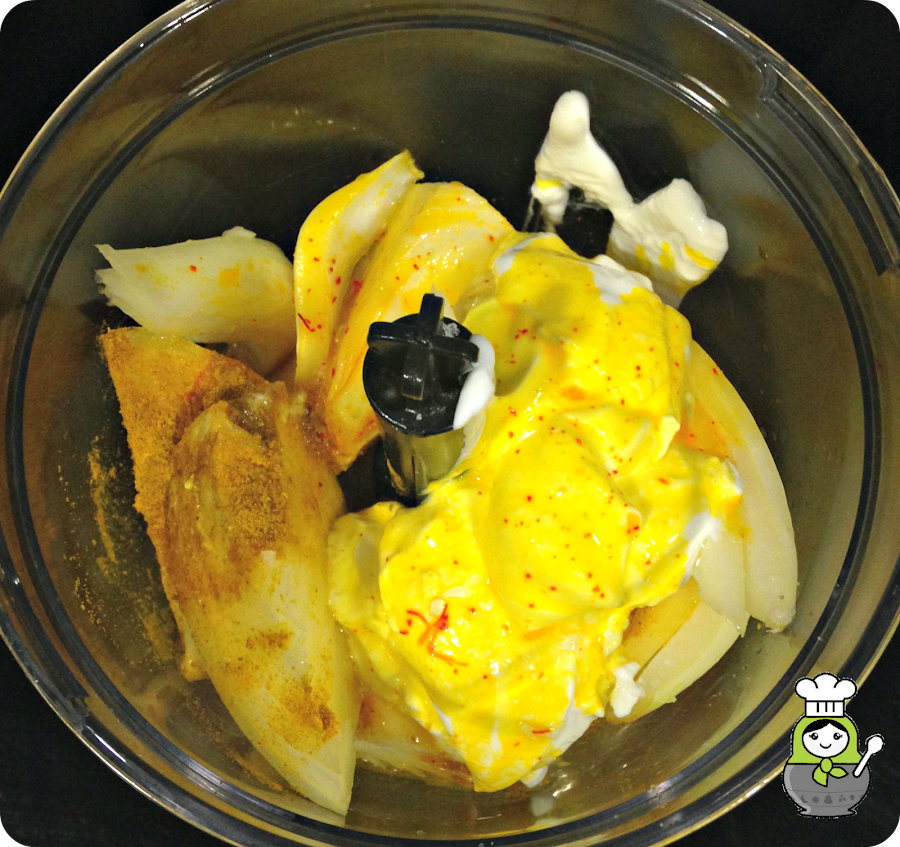 En el vaso triturador de la batidora, colocamos la cebolla troceada, el aceite de oliva, el zumo de limón, la cúrcuma, la sal, el yogur y la infusión de azafrán. Trituramos todos los ingredientes hasta obtener una pasta lisa.