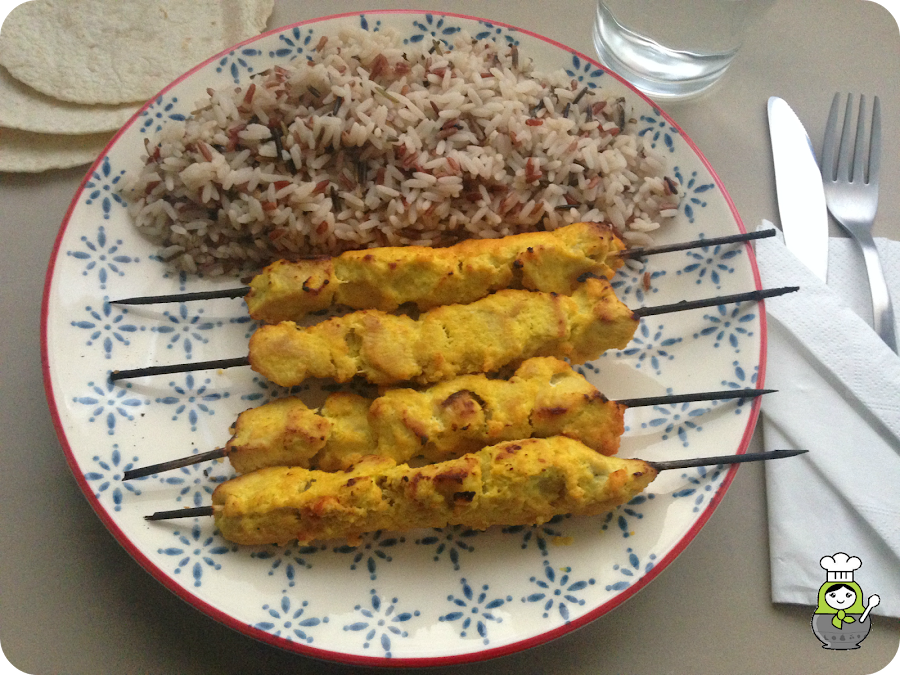 Al día siguiente, montamos las brochetas. Yo he utilizado unos guantes de vinilo para que fuese mucho más fácil y limpio. Colocamos las brochetas montadas en una fuente y cocinamos en el horno a máxima potencia (o en una barbacoa o parrilla) hasta que el pollo comience a dorarse ligeramente, entre 15 y 20 minutos.