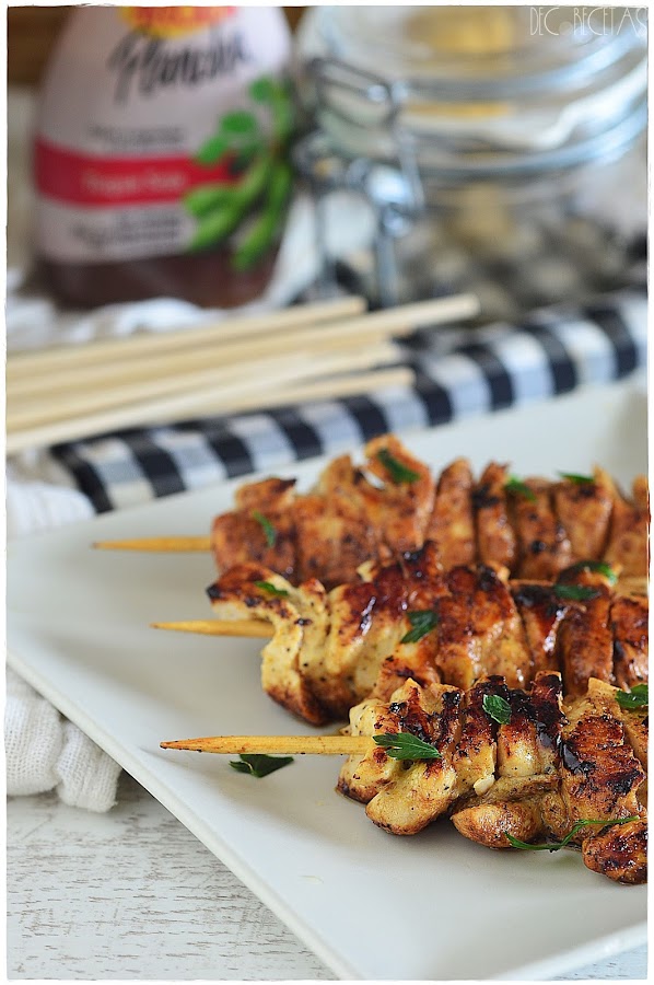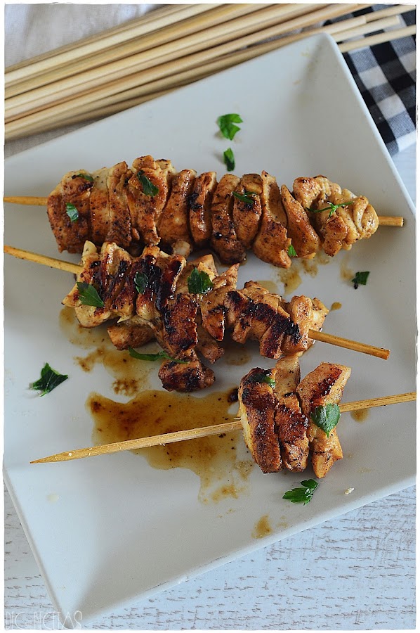 Parto una pechuga de pollo en láminas finas que introduzco dentro de un palo de brocheta. Añado la salsa de Avecrem hasta cubrir bien por completo y dejo macerando un mínimo de dos horas dentro de la nevera. Cocino a la plancha pasado el tiempo espolvoreando perejil por encima
