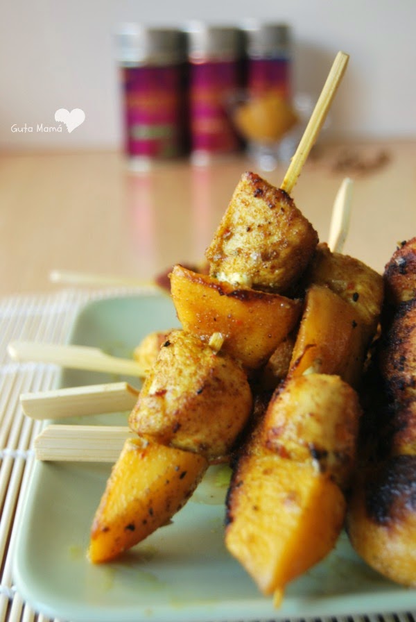 Presentar en la mesa todo junto para que cada comensal se prepare el plato a su gusto. Como idea, también podéis poner los trozos de melocotón insertados en la brocheta, como hemos hecho nosotros.