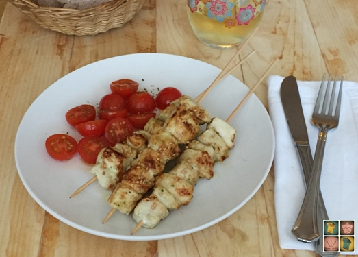 Escurrir el pollo y ensartarlo en brochetas. Asarlo en la plancha con unas gotas de aceite bien caliente, unos 3 minutos por cada lado, dependiendo del grosor de los tacos. Espolvorear los pinchos con semillas de sésamo y servirlo enseguida.* Yo las acompañé con unos tomates cherry, pero si podéis dedicarle un poco más de tiempo, una escalibada le iría perfecta.