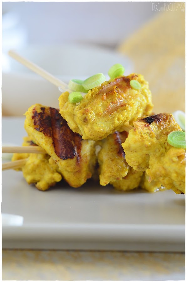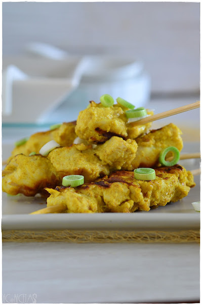 Gran parte del misterio de la receta, no es otro que la salsa donde se marina o macera el pollo al igual que su acompañamiento pudiendo ser arroz, salsa de cacahuetes o maní (Con mantequilla de maní también serviría), salsa satay estilo Thai... Luego lo importante es cocinar las brochetas o pinchitos a la brasa o a la plancha como es mi caso. Os dejo el vídeo de como elaborar este pollo al estilo satay: