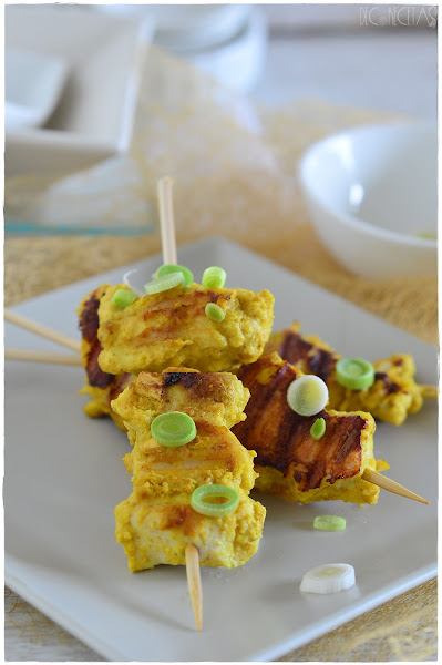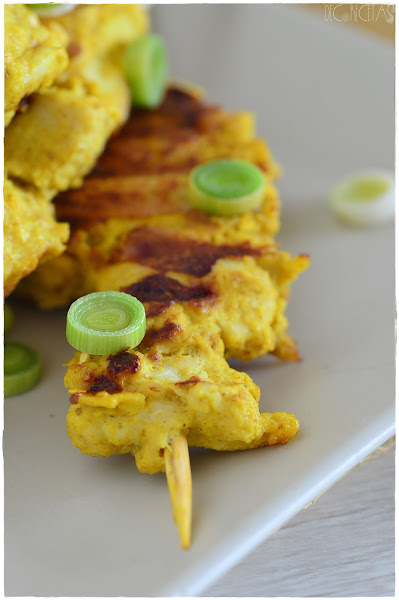 Trituramos conjuntamente media cebolla, dos dientes de ajo, un chorrito de limón, una cucharada de lemongrass seco, 30ml de aceite virgen extra, sal, y media cucharada de comino, curcuma y cayena molida. Introducimos 2 pechugas de pollo cortadas en taquitos en dicha mezcla y dejamos macerando mínimo 4 horas antes de introducir cuatro trocitos de pollo por brocheta y realizarlas a la plancha. Para acompañar, yo simplemente añadí ajetes frescos