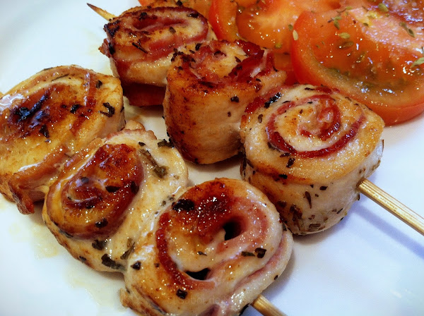 Cubre cada filete de pollo con el lacón. Enróllalos. Sujeta con unos palillos de madera.