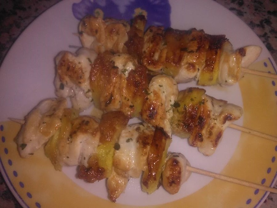 Trocear la piña e ir preparando las brochetas intercalando un trozo de piña con uno de pechuga.