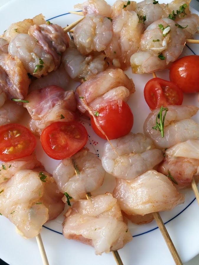 Ensarta en palitos de pinchitos, alternando rape, langostinos, tomates, y asa en la plancha, parrilla o sartén, bien caliente, dos minutos aproximadamente, por cada lado. Que estén las piezas doradas, pero no secas, que estén jugosas. Según el tamaño, de 2 a 3 minutos.
