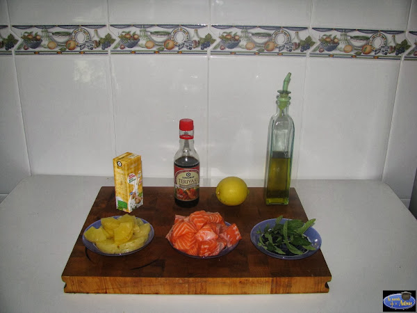 Limpiamos bien el salmón de espinas y lo cortamos en cubitos más o menos iguales.Preparamos un marinado con el zumo del limón,4 cucharadas soperas de salsa teriyaki Kikkoman, hierbabuena picadita y 6 cucharadas de aceite de oliva.En un bol cubrimos el salmón con el marinado y dejamos reposar una hora más o menos.