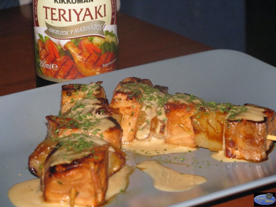 Aquí os traigo una combinación de pescado y fruta deliciosa.O por lo menos a mi me lo parece así que ya me diréis si os animáis a probarlo.Me encanta el salmón y como he podido ver en otras recetas va muy bien con la piña así que le puse un palito y un poco de salsa y listo.Eso sí el toque que le da el marinado con la salsa teriyaki de Kikkoman es estupendo.Allá vamos...
