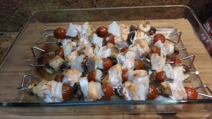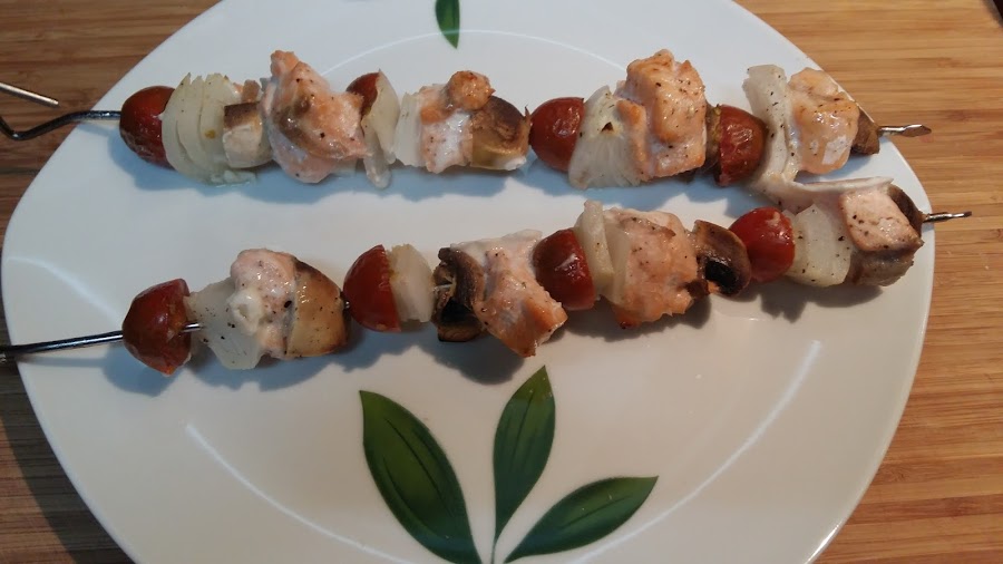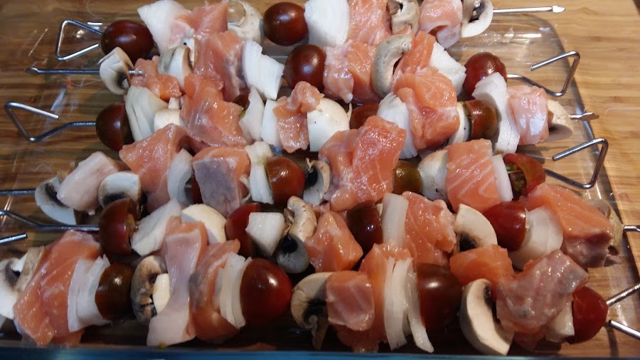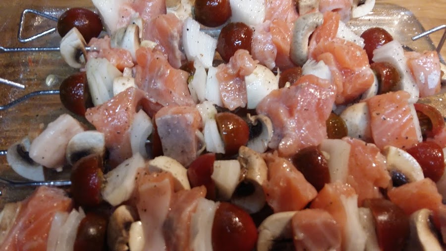 Hola holaaa!!! Os apetece un poquito de salmón? Pues venga, unas brochetas ligeras y sabrosas para cualquier cena. Da igual si estás como yo en plena operación bikini o no, estas brochetas están buenísimas. Yo he cocinado para tres personas aunque los ingredientes os los voy a poner para 4 que así es más fácil sacar raciones.Espero que os gusten.