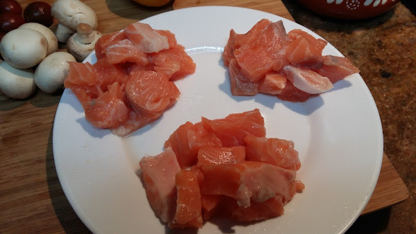 tomate, cebolla, salmón y champiñon y vuelta a empezar.