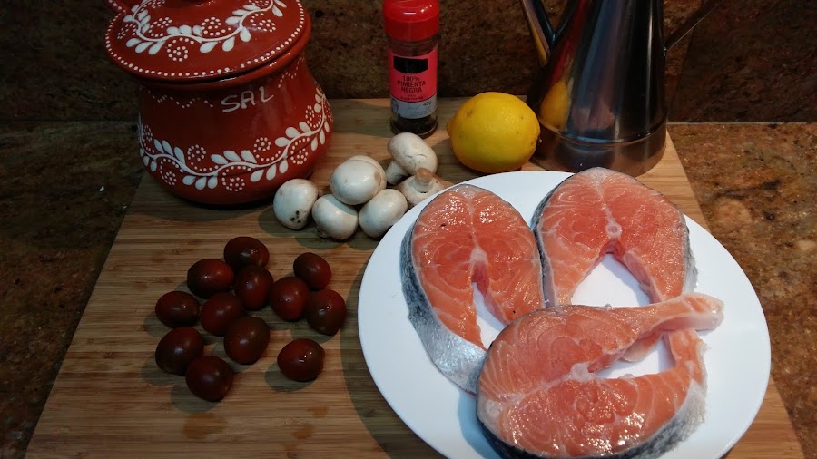 4 rodajas de salmón fresco, 16 tomates cherry, 8 champiñones grandes, 8 cebollitas chalotas, 1 limón, aceite de oliva, pimenta negra molida y sal.