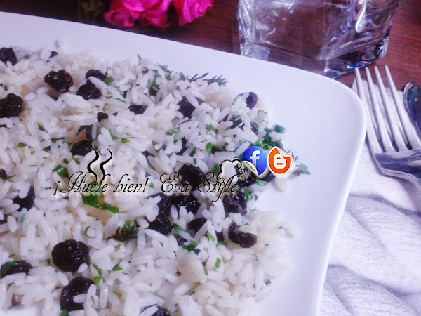 7.- En una sartén añadimos unas cucharas de margarina, cuando este derretida agregamos las pasas, rehogamos varios minutos. Introducimos el arroz, removiendo con la cuchara de madera durante 3 o 4 minutos. Retiramos del fuego, lavamos y picamos las hierbas aromáticas y mezclamos con el arroz caliente.