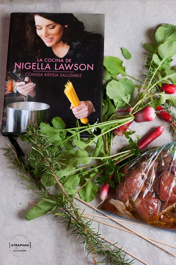 Ni son unas simples brochetas de ternera ni la salsa os debería pasar por alto. A simple vista las recetas de Nigella Lawson parecen muy simplonas, siempre os lo he comentado, pero después, una vez que las cocinas, se convierten en recetas con mucho sabor. Me fijé en esta receta del libro de La Cocina de Nigella Lawson por la salsa. Ahora que estamos en tiempo de dietas ésta salsa me parece mucho más ligera que las que hacemos habitualmente. La base es de yogur y mostaza, y los rábanos le aportan mucho sabor sin muchas calorías. Éstos rábanos son del huerto de mi suegro, recién cogidos media hora antes de preparar la receta, sin duda un privilegio. Aunque en la receta de Nigella la salsa es de rábanos picantes. los míos no lo son, pero le aportan sabor, y eso es lo importante. Las brochetas tienen también mucho fundamento pues van aderezadas antes de pasarlas por la plancha. El libro no es la primera vez que aparece por aquí, son ya muchas las recetas que he hecho de él. Es de Editorial Planeta y lo podéis adquirir a un precio de 28 euros más o menos.